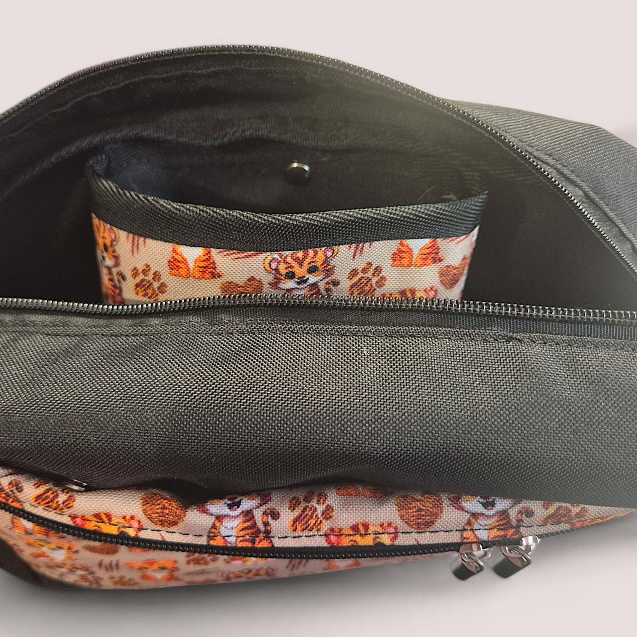 Posiada aż 3 kieszenie! Główna, bardzo pojemna kieszeń na przykład na: portfel, szarpak (również duży), piłkę, miskę, ładowarkę i wiele innych rzeczy. Dodatkowo z przodu nerki dwie kieszenie, jedna zapinana na zamek, oraz ta bardziej odkryta, zapinana na napy. Obie te kieszenie pomieszczą z powodzeniem telefon, gaz pieprzowy, klucze bądź inne potrzebne rzeczy.